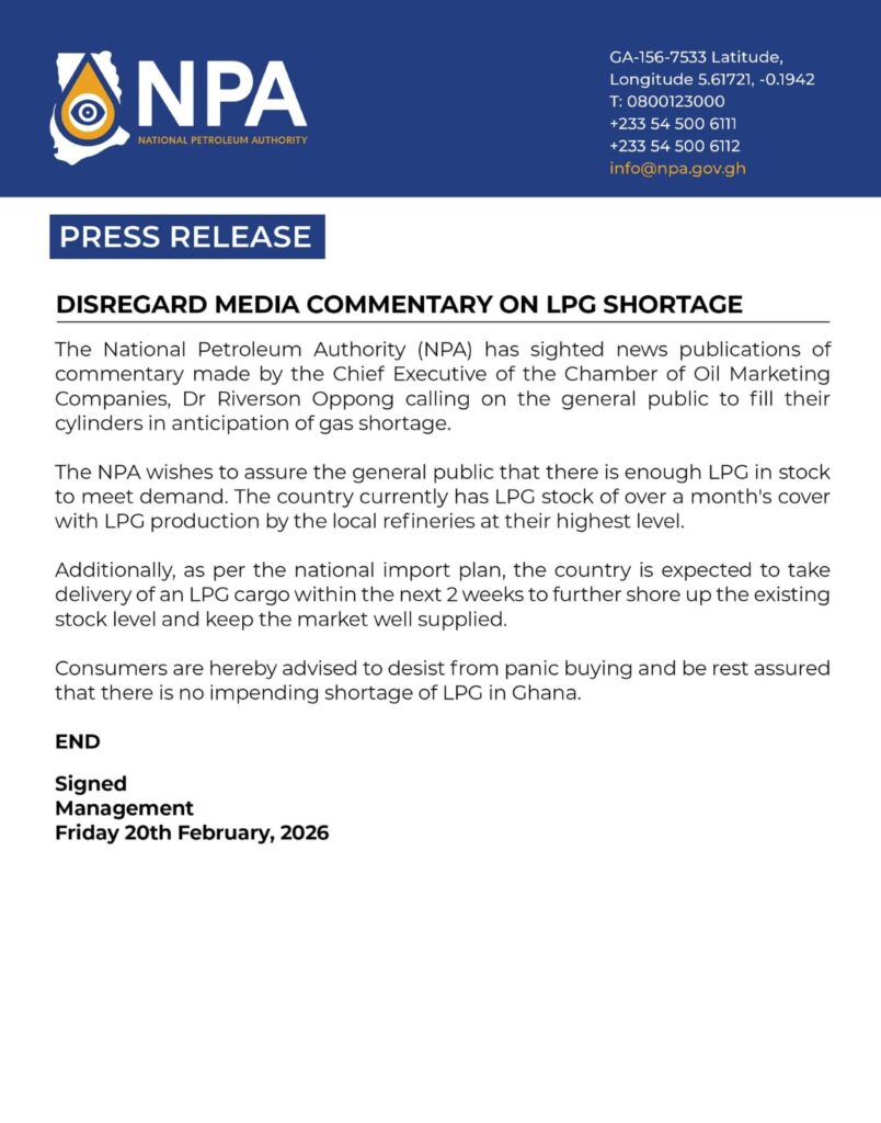 The National Petroleum Authority (NPA) has urged the public to disregard media commentary suggesting an imminent shortage of Liquefied Petroleum Gas (LPG), assuring consumers that there is adequate stock to meet demand.